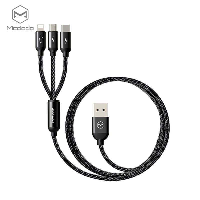 Máte doma více mobilních zařízení a každé s jiným konektorem? Musíte se při nabíjení dělit o jeden adaptér? Máme tu právě něco pro Vás. S Mcdodo kabelem 3 v 1 se dostane na všechny! Jeden kabel nabízí připojení současně pro 3 zařízení. Můžete tedy zároveň nabíjet iPhone, tablet s USB C konektorem a další telefon s MicroUSB konektorem. Připojit můžete jakákoliv zařízení disponující těmito konektory. Fantazii se meze nekladou.