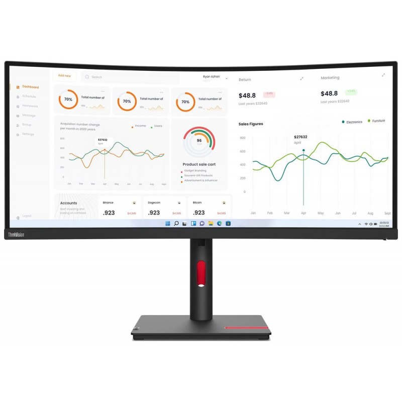 LED monitor Lenovo ThinkVision T34w-30 s prohnutým displejem, který je určen pro náročnou práci a multitasking. Na obří ploše 34" zobrazí rozsáhlé pracovní projekty, tabulky, dokumenty nebo aplikace ve více oknech najednou. Obrazovka nabízí vysoké rozlišení WQHD, díky čemuž produkuje ostrý obraz plný detailů. Zakřivený design podporuje přirozené zorné pole a umožní vám komfortní sledování po dlouhou dobu, v případě sledování multimédií vás rovněž vtáhne do centra dění.