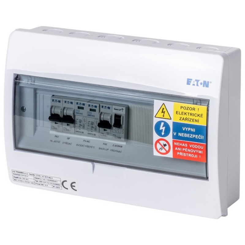 V rozvaděči je osazen jistič B16/1 pro jištění vstupu do střídače a výstupu pro zálohované okruhy. K dispozici je také manuální dvoupolový přepínač pro přemostění zálohovaných okruhů v době servisu nebo vypnutí střídače.