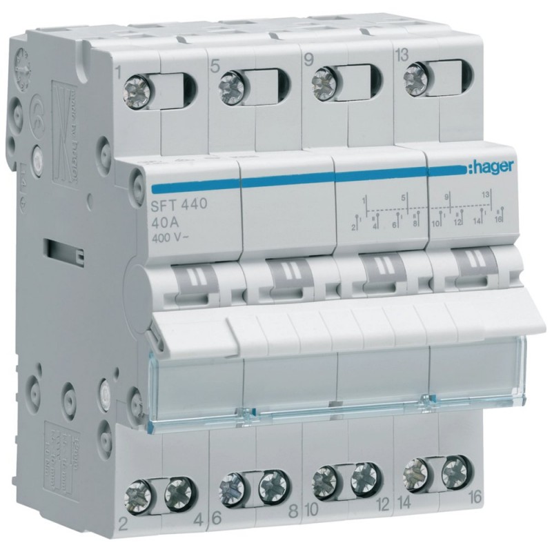 Čtyřpólový skupinový přepínač Hager SFT440 se jmenovitým proudem 40 A pro přepínání mezi dvěma napájecími zdroji.