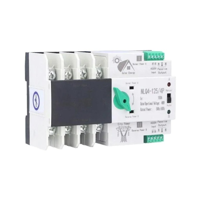 Automatický přepínač sítí s pasivními silovými kontakty 4P a ovládacími kontakty pro řízení zařízení podle přítomnosti síťového napětí.