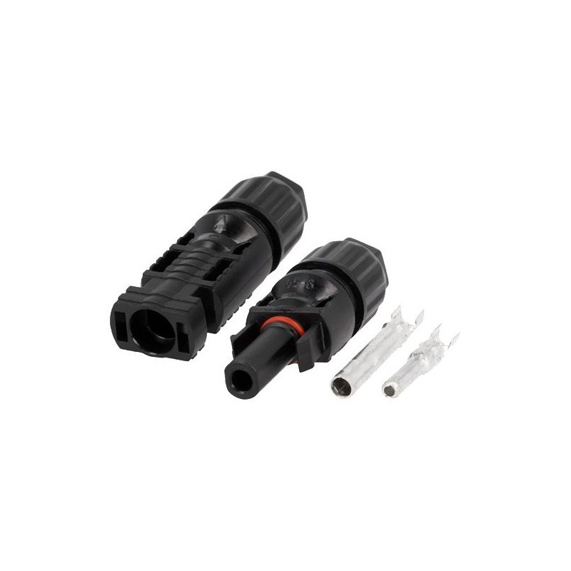 Konektor pro spojování solárních panelů. Vidlice + zásuvka, určeno pro kabely 4-6 mm2 s kontakty, červený proužek, cena za pár (samice + samec).