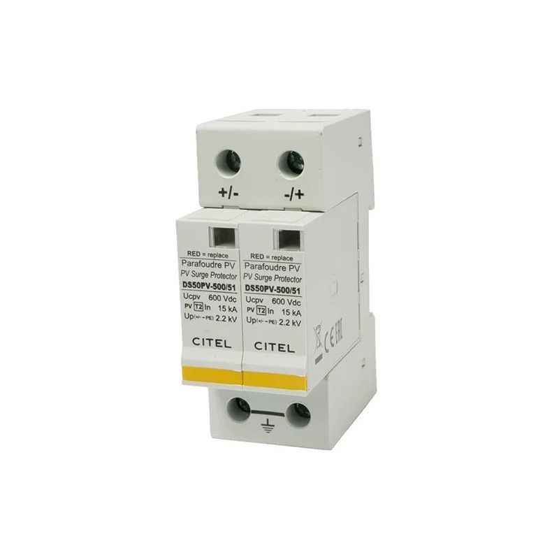 Svodič přepětí speciálně vyvinutý pro ochranu fotovoltaických zařízení před přepětím. Svodiče přepětí DS 50PVS jsou dvoudílné svodiče typu 2 (s modulární strukturou) a montují se na DIN lištu. Výměnný modul umožňuje snadnou výměnu poškozeného dílu bez nutnosti demontáže připojených vodičů.