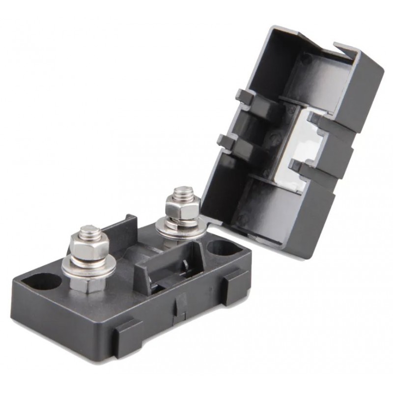 Držák určený pro pojistky Victron MIDI. Má odnímatelnou krytku a pojistky se připevňují na dvojici šroubů M5.