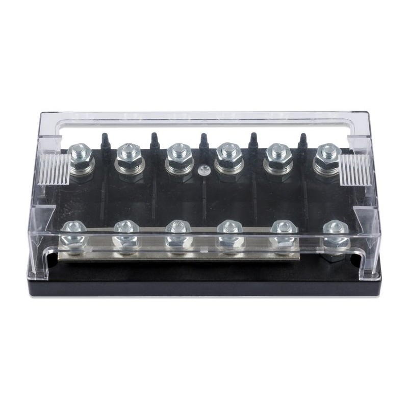 Držák pro až 6 pojistek Mega o maximálních proudech 60–500 A při 32 V nebo 125–300 A při 58 V. Snímatelná průhledná krytka. Pojistky se v držáku připevňují na dvojici šroubů M8. Určeno pro připevnění na zeď nebo jiný pevný podklad. Standardně se umísťuje mezi akumulátor a odběrné zařízení (např. měnič/nabíječka MultiPlus, Quattro atd.)