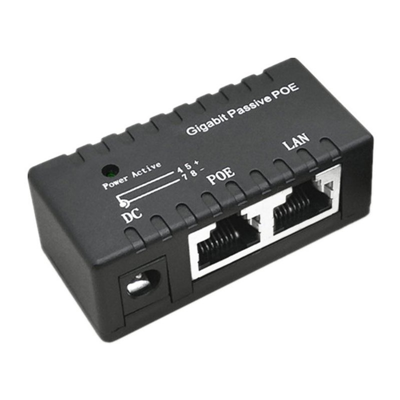 Pasivní PoE injektor pro napájení IP kamer a dalších síťových zařízení přes ethernetový kabel.