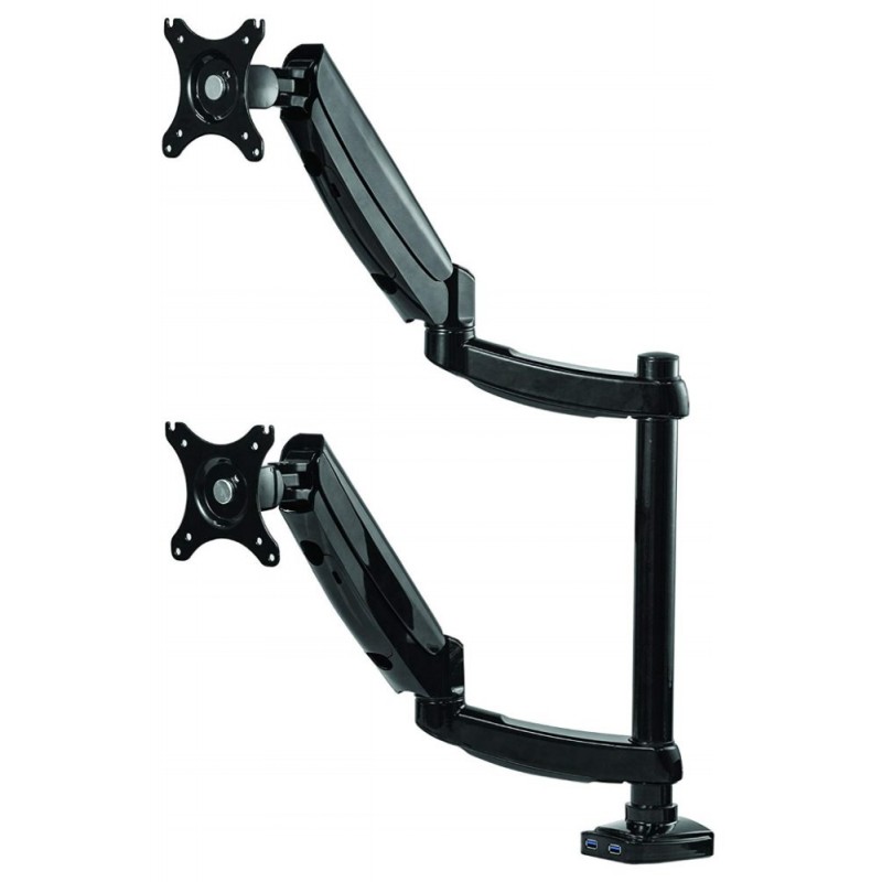 Nastavitelný držák pro dva monitory ušetří místo na pracovním stole. Je vhodný pro ploché LCD monitory o velikosti 17" až 30" a celkové hmotnosti do 20 kg. Snadno se připevní pomocí svorky nebo průvlaku na desku stolu. Technologie plynových pružin umožňuje snadné nastavení monitorů pro práci a sdílení obrazovky. Dva USB 3.0 konektory pak umožňují snadné připojení oblíbených zařízení. Intuitivní systém správy kabeláže minimalizuje nepořádek.