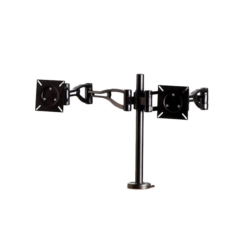 Stylový držák pro dva monitory ušetří místo na pracovním stole. Vhodný pro ploché LCD monitory o velikosti 26" a celkové hmotnosti do 20 kg. Snadná montáž k desce stolu o šířce 25 až 76 mm. Rozsah pohybu od 89 do 419 mm výšky, hloubka posunu od 63 až po 686 mm. Nastavitelný náklon +/- 37°, možnost otáčení obrazovky až o 360°.