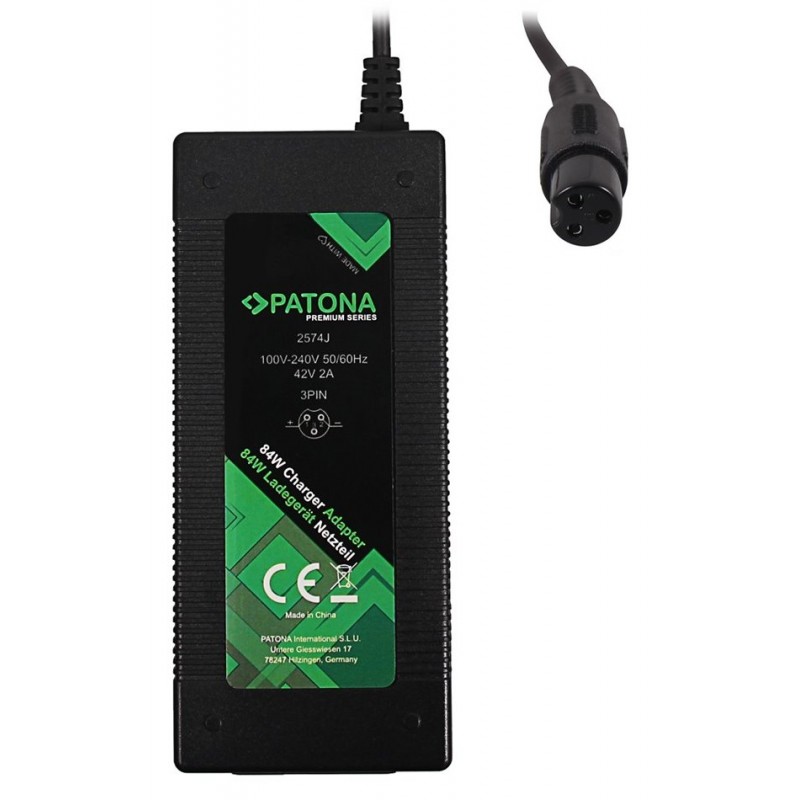 Napájecí adaptér PATONA s výkonem 84 W pro pro elektrické koloběžky a Hoverboardy s konektorem 3pin. Ideální pro 36V baterie. Nabíječka disponuje funkcí inteligentního napájení, ochranou proti zkratu, nadměrnému nabíjení či zahřívání. Součásti balení je i síťový kabel do zásuvky.