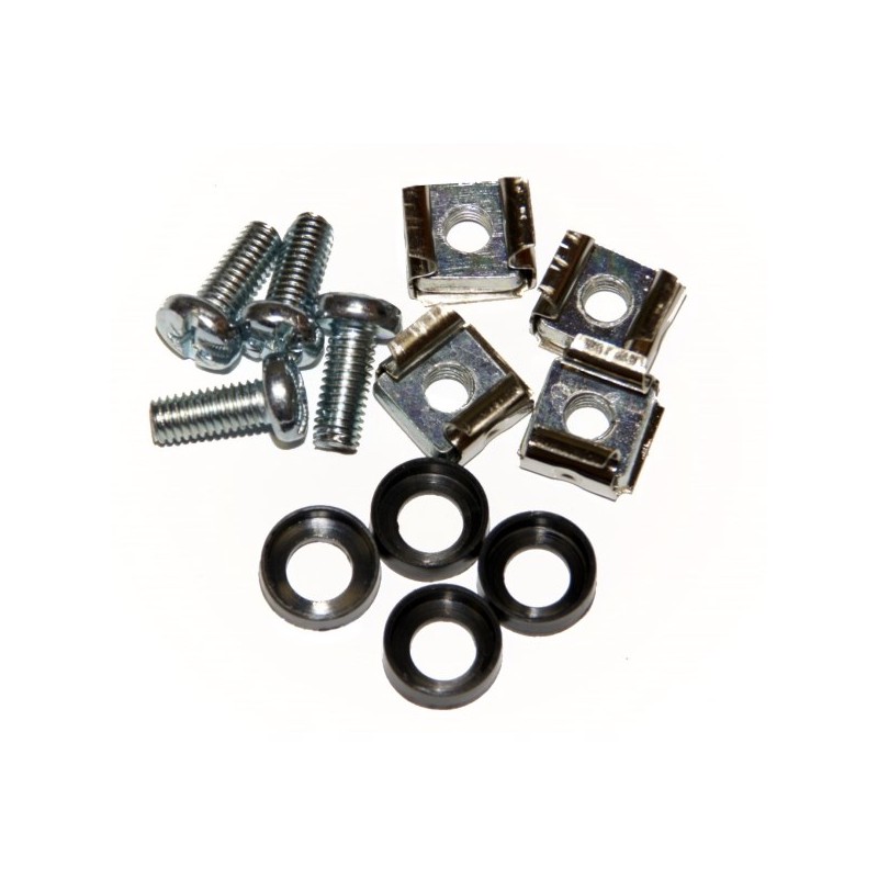 Sada spojovacího materiálu samostatně baleného pro montáž zařízení k 19" lištám. Průměr šroubu je 5 mm tedy metrický závit M5, klecová matice je pro otvor 9,5 × 9,5 mm.
