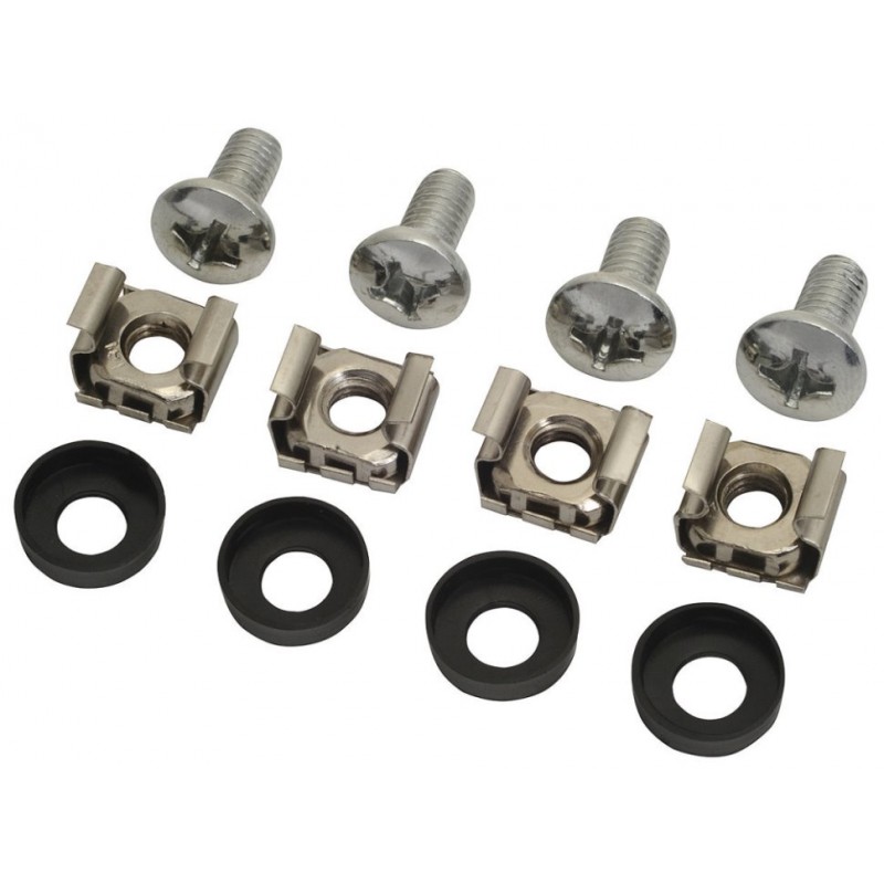 Sada spojovacího materiálu samostatně baleného pro montáž zařízení k 19" lištám. Průměr šroubu je 6 mm tedy metrický závit M6, délka šroubu včetně hlavy je 19,7 mm a délka závitu pak 15,5 mm. Klecová matice je pro otvor 9,5 x 9,5 mm.