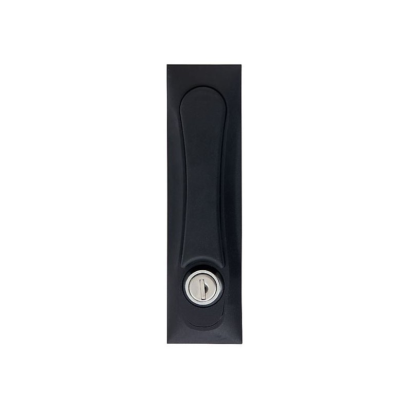 Plastová otočná klika s klasickou zámkovou vložkou, která je určená pro stojanové rozvaděče. Klika má černou barvu.