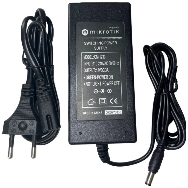 Napájecí adaptér s výstupním napětím DC 12 V, max. proudem 3 A a konektorem 5,5 × 2,1 mm. Maximální výstupní výkon je 36 W.