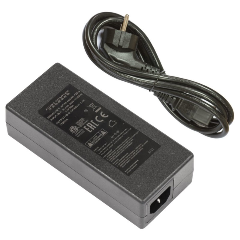 Napájecí adaptér s výstupním napětím DC 48 V, max. proudem 2 A a výkonem 96 W. Zdroj je dodávaný jako značkové příslušenství výrobcem MikroTik.