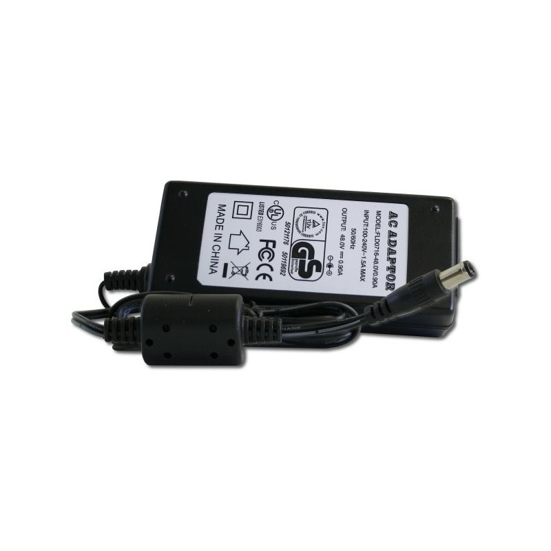 Napájecí adaptér pro zařízení RouterBoard s výstupním napětím 48 V a výkonem 38 W. Adaptér je dodáván s napájecím kabelem.