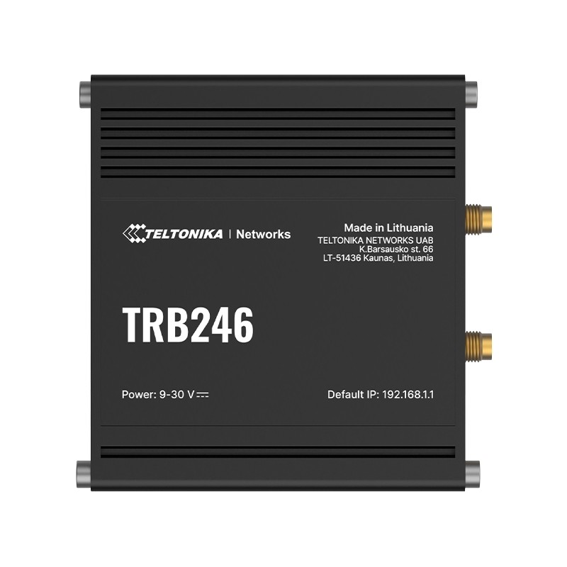 TRB246 je robustní průmyslová brána navržená pro spolehlivou M2M komunikaci v náročných provozních podmínkách. Zařízení nabízí 4G LTE Cat 4 konektivitu s rychlostmi až 150 Mbps DL/50 Mbps UL, zpětnou kompatibilitou s 3G a 2G sítěmi a podporou dual SIM s automatickým přepínáním pro maximální dostupnost připojení.