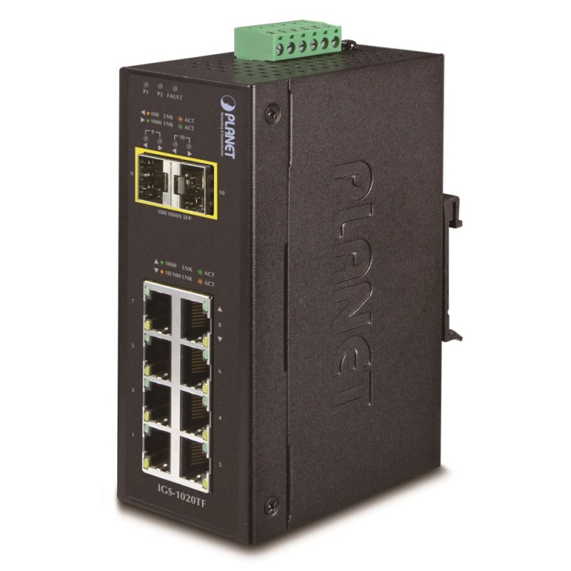 Průmyslový přepínač a konvertor 8x 10/100/1000Base-T, 2x SFP 100/1000Base-X. Energeticky efektivní dle 802.3az.