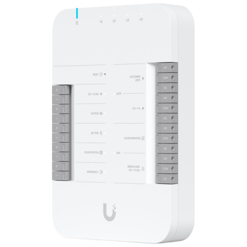 UniFi Access Door Hub je inteligentní jednodveřový IP kontrolér, který je součástí řešení UniFi Access. Univerzální rozhraní podporuje většinu elektronických a magnetických zámků, a je kompatibilní s 12V příslušenstvím (tlačítka, alarmy, senzory pohybu atd.). Splňuje certifikace CE, FCC, IC, UL 294 a CAN/ULC-60839-11-1 (Třída 1).