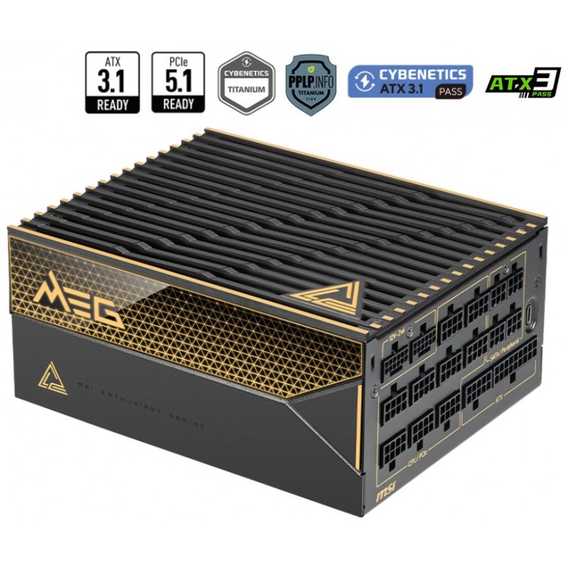Napájecí zdroj o výkonu 1600 W je osazen tichým a přitom výkonným 135 mm velkým ventilátorem. Zdroj splňuje certifikaci 80PLUS Titanium, standard ATX 3.1 a má odpojitelné kabely. Prostřednictvím MSI Gaming Intelligence je možné v reálném čase sledovat spotřebu jednotlivých komponentů či nastavovat rychlost ventilátoru.